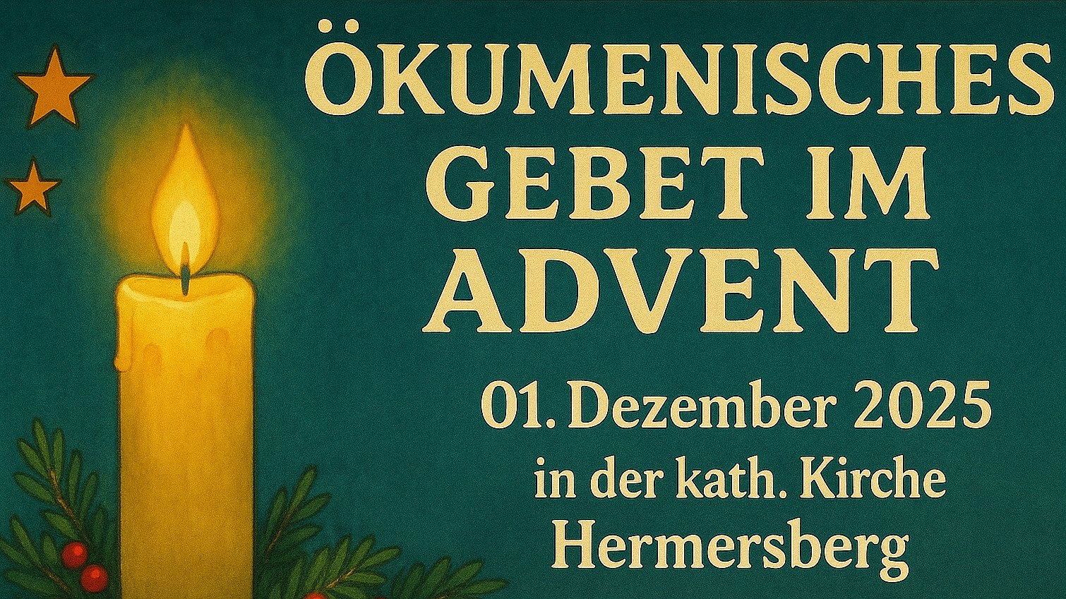 Am 01.12.2025 um 19 Uhr lädt der Ökumenekreis Hermersberg/Weselberg zum ökumenischen Gebet im Advent in der katholischen Kirche Hermersberg ein.